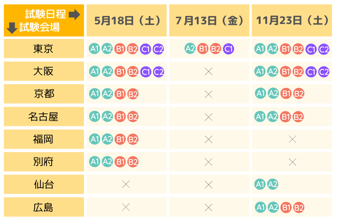 しかし、7月に東京で開催される分についてはA2、B1、B2、C1のみ受験可能であり、A1とC2の試験は行われません。